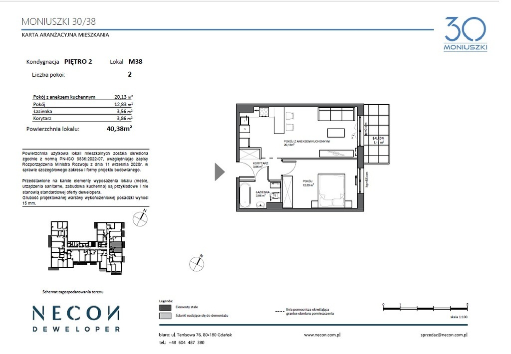 Przedmiotem oferty jest przestronne mieszkanie o powierzchni 40,38 m², położone na 2 piętrze nowoczesnego budynku. Lokal będzie gotowy do odbioru w 2025 roku.