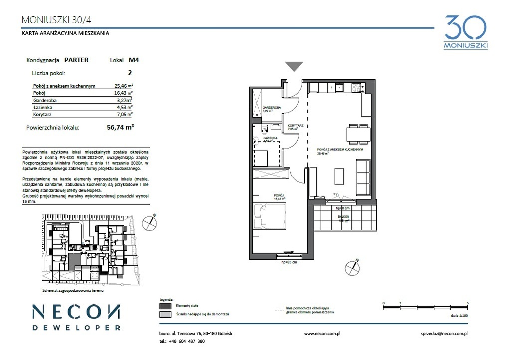 Przedmiotem oferty jest przestronne mieszkanie o powierzchni 56,74 m², położone na parterze nowoczesnego budynku. Lokal będzie gotowy do odbioru w 2025 roku.