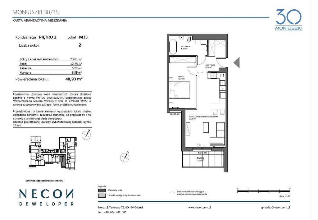 Przedmiotem oferty jest przestronne mieszkanie o powierzchni 48,93 m², położone na 2 piętrze nowoczesnego budynku. Lokal będzie gotowy do odbioru w 2025 roku.