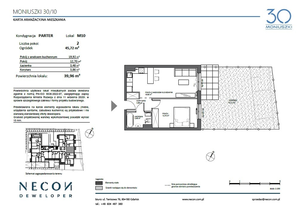 Do mieszkania przynależy ogród o powierzchni 45,72 m², idealny na poranną kawę, popołudniowy relaks czy spotkania w gronie najbliższych.