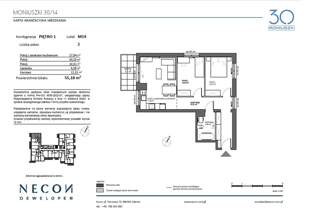 Przedmiotem oferty jest przestronne mieszkanie o powierzchni 55,18 m², położone na 1 piętrze nowoczesnego budynku. Lokal będzie gotowy do odbioru w 2025 roku.